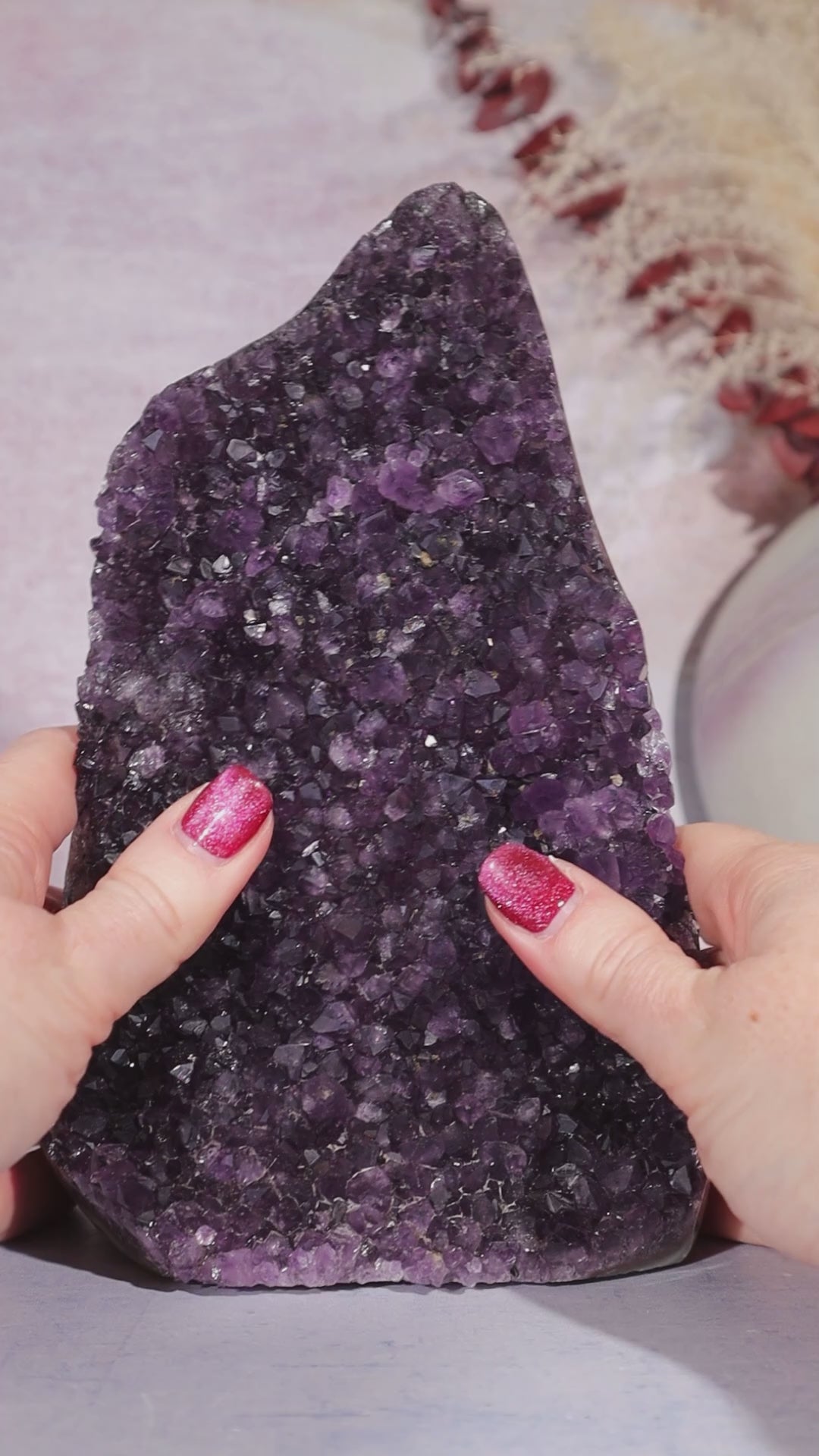 This 2.3kg cut base Amethyst freeform showcases rich purple tones with sparkling druzy covering the entire surface. Catching the light from every angle it has a strong visual presence and a beautifully balanced form. A striking display piece that brings calm and harmony to any space.