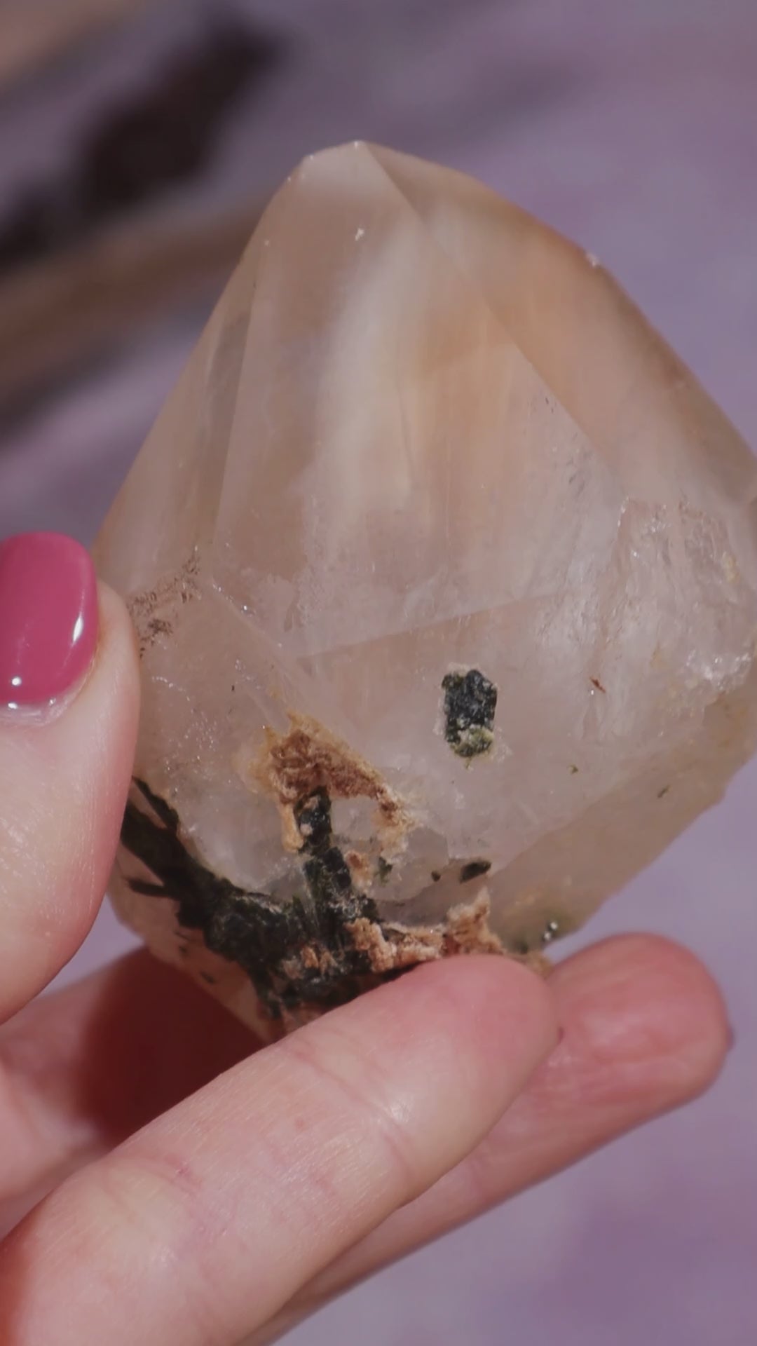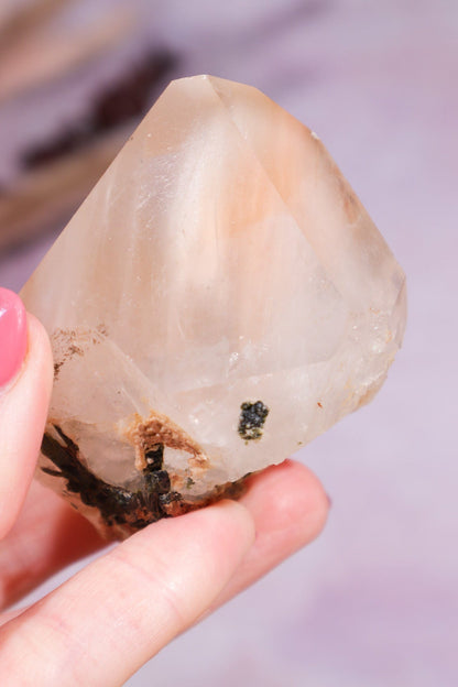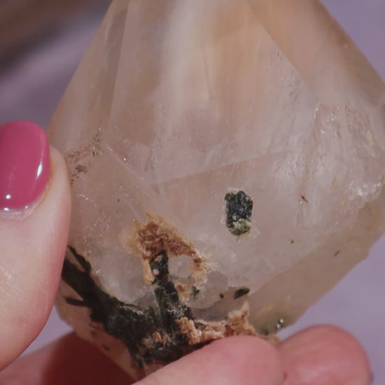 This gorgeous natural points has Green Tourmaline inclusions. Being a natural point it has slight imperfections, please check the photos and videos.