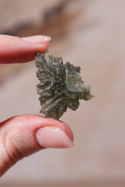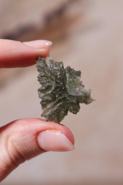 Moldavite, also called Vltavin, is a tektite or "terrestrial debris" that found its way onto Earth after a meteoric explosion about 15 million years ago at the Nördlinger Ries Crater. The gorgeous texture of Moldavite is a result of pervasive etching by naturally occurring CO2 and humic acids present in groundwater.
