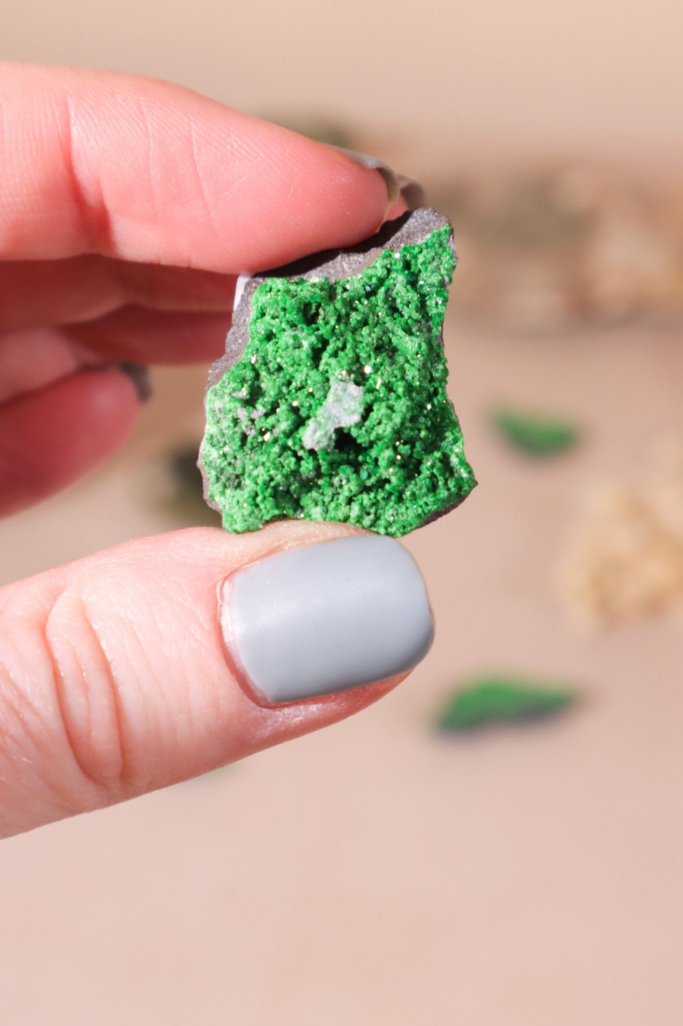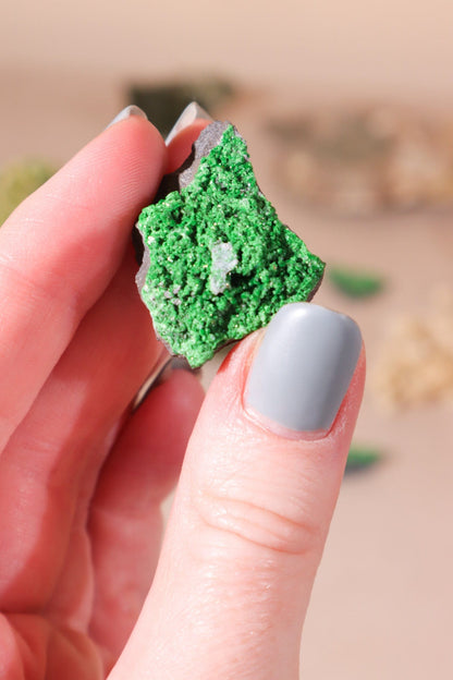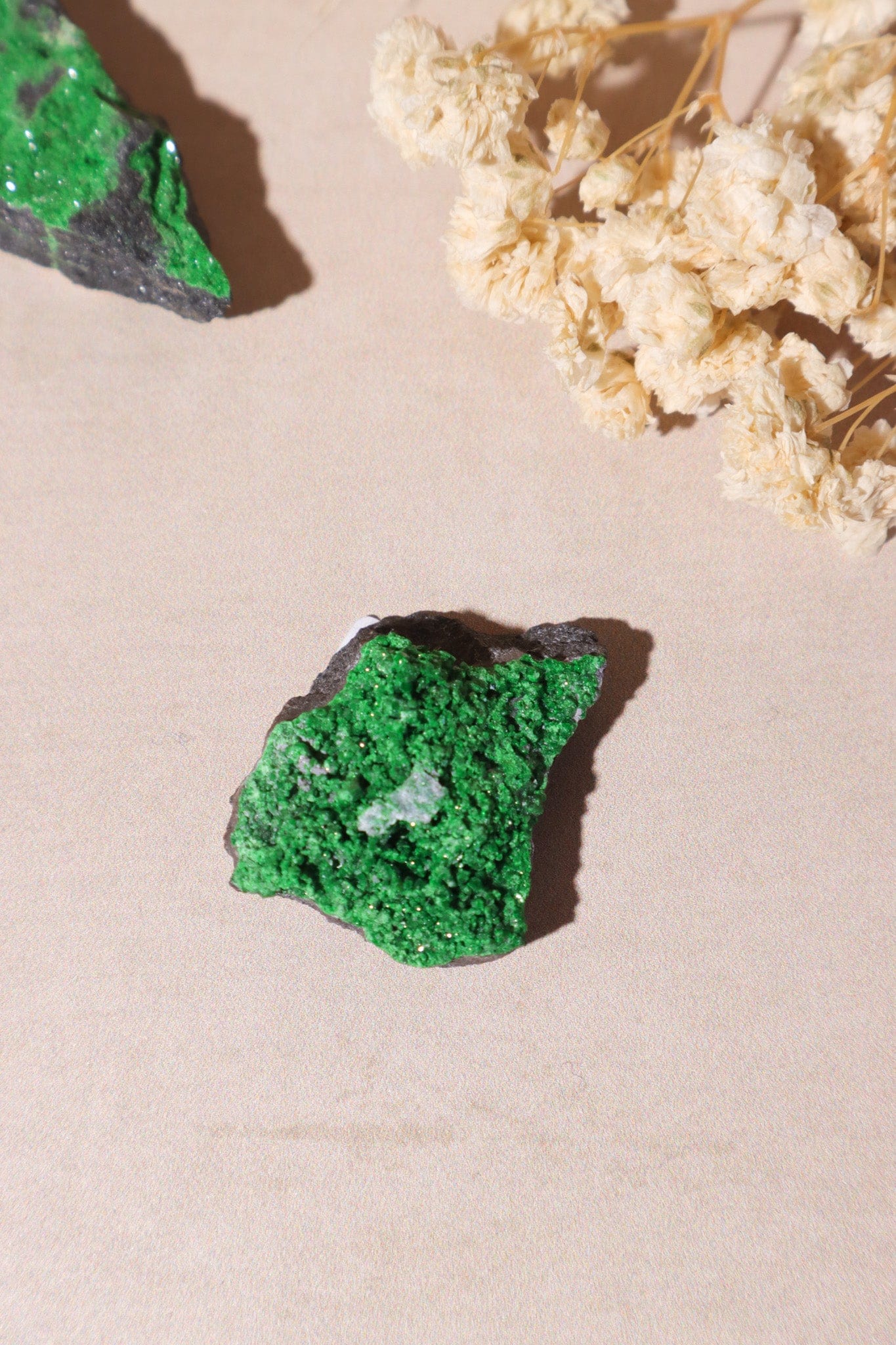 Uvarovite Garnet deeply resonates with the Heart Chakra, inviting a profound connection with one's spiritual essence. This radiant green gem opens pathways for love, compassion, and spiritual growth. As it aligns with the Earth element, Uvarovite Garnet serves as a conduit for grounding energies, allowing individuals to anchor their spiritual experiences in the physical realm.