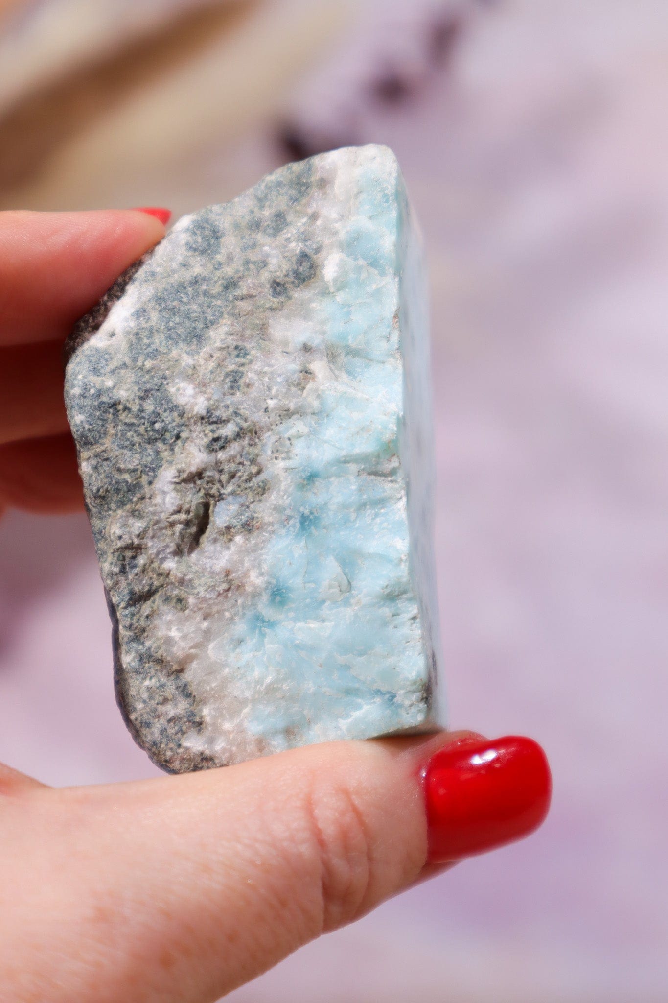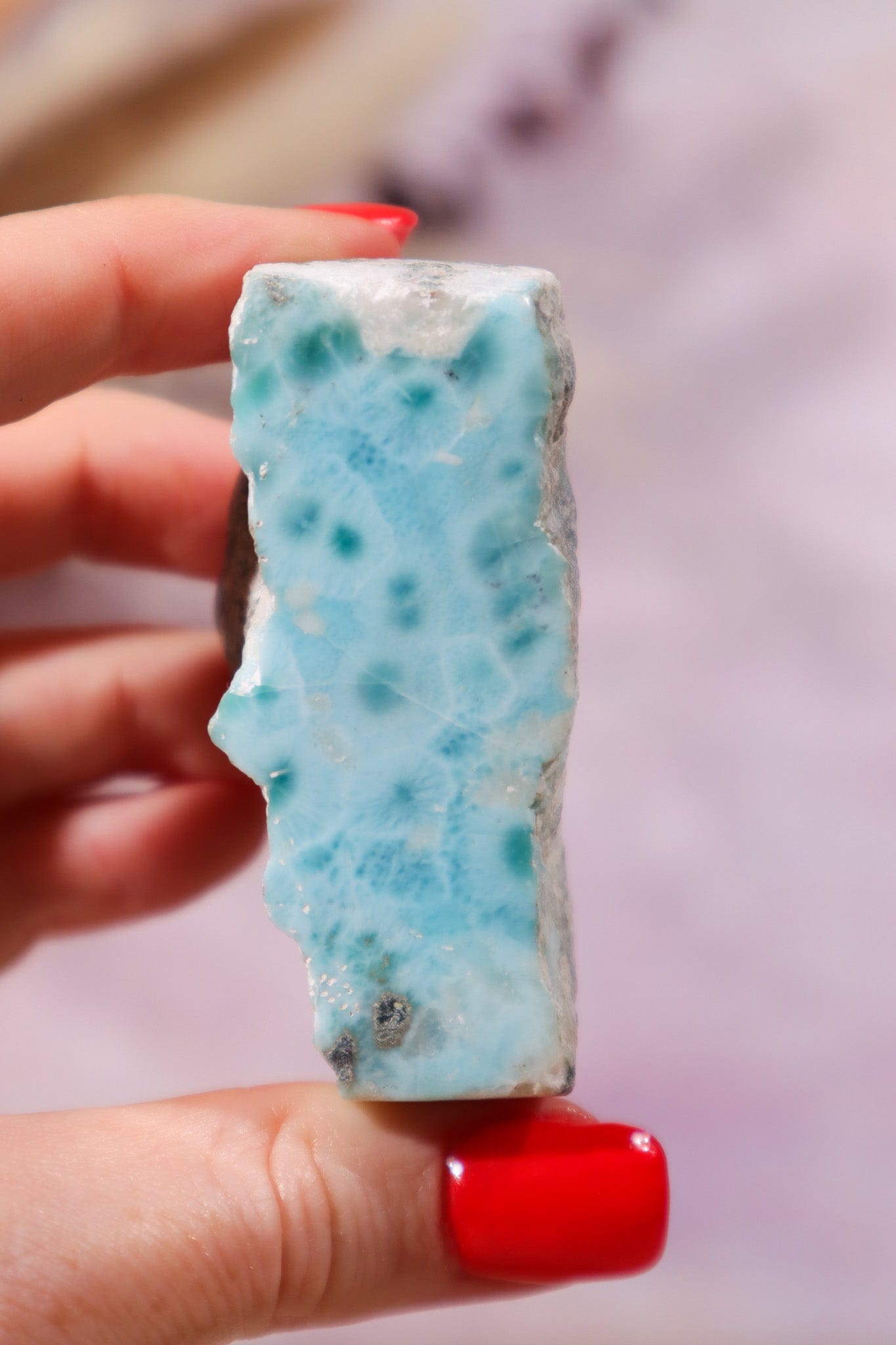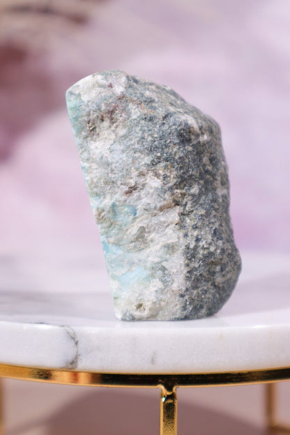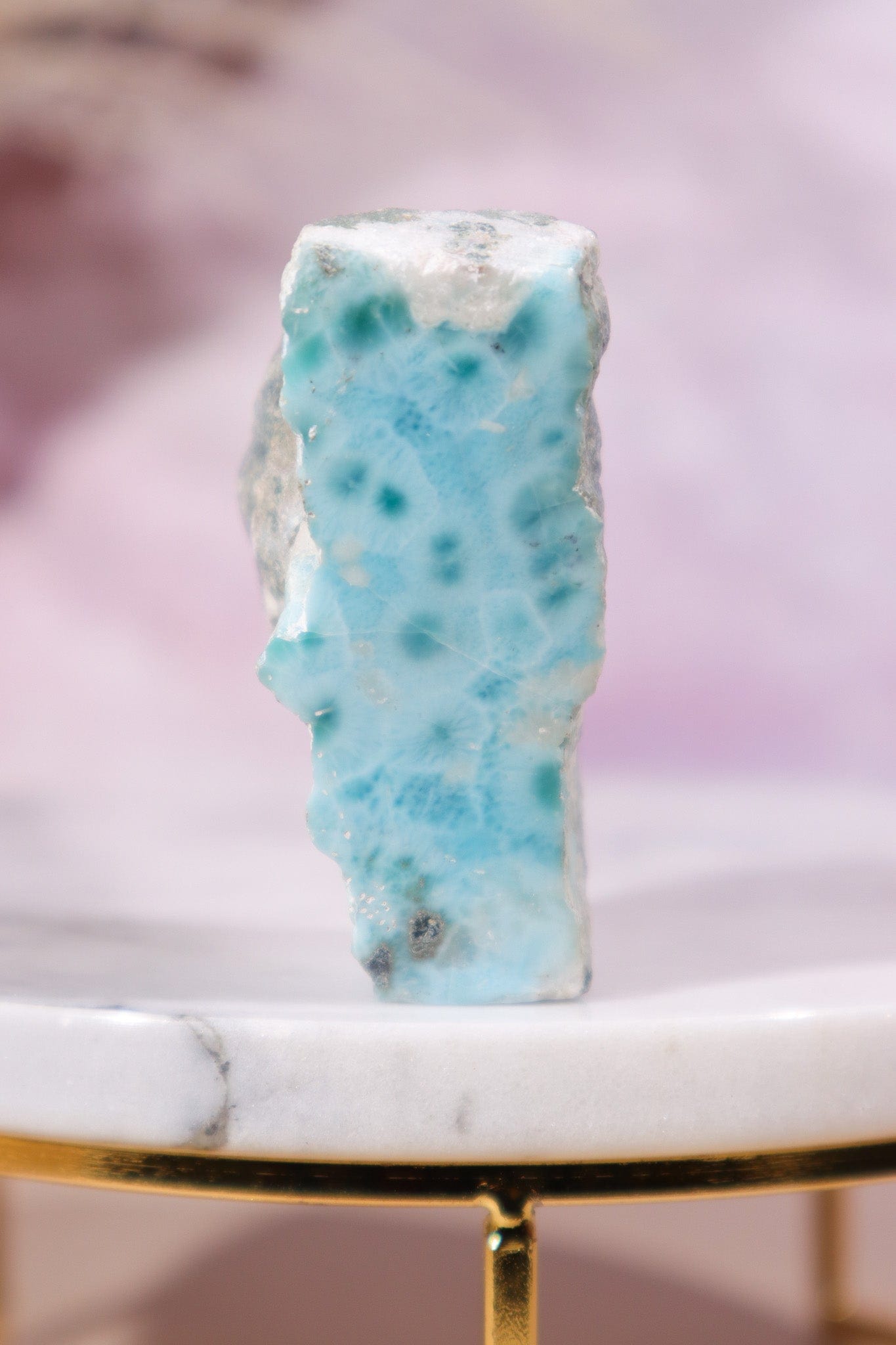 Larimar was first discovered in the early 20th century in the Dominican Republic by a local Dominican and a visiting Peace Corps volunteer. They named the stone Larimar after combining Larissa, the name of the local man's daughter, and mar, the Spanish word for sea, after the crystal’s resemblance to the waters of the Caribbean. Larimar is formed through a combination of volcanic activity and hydrothermal processes, and is primarily composed of pectolite, a sodium calcium silicate mineral. It owes its distinctive blue colour to the presence of copper impurities.