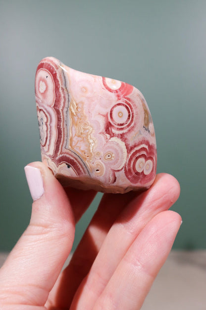 More than just pretty in pink, this beautiful crystal is a real love healer. First found in the silver mines of Romania, deposits are now located all around the world. Rhodochrosite is named from the Greek words for 'rose' and 'colour'. Formed through the metamorphism of manganese-rich rocks, Rhodochrosite is often found in stalactitic formations, displaying its characteristic banded patterns.