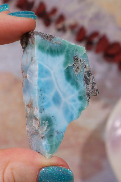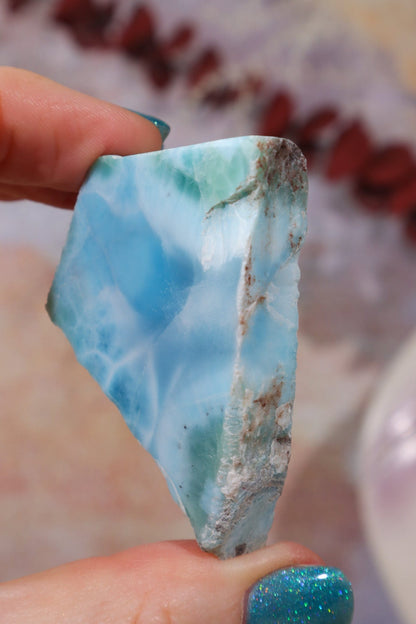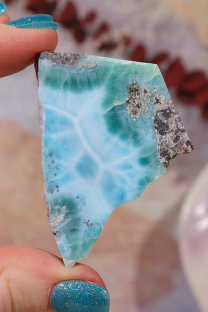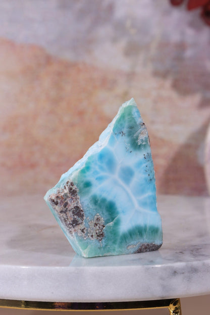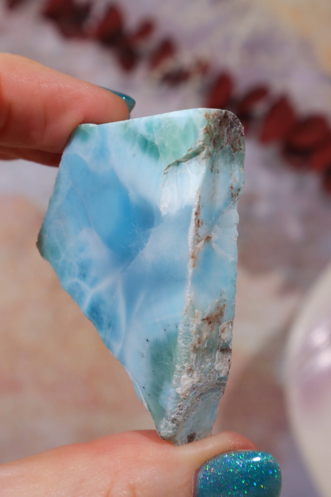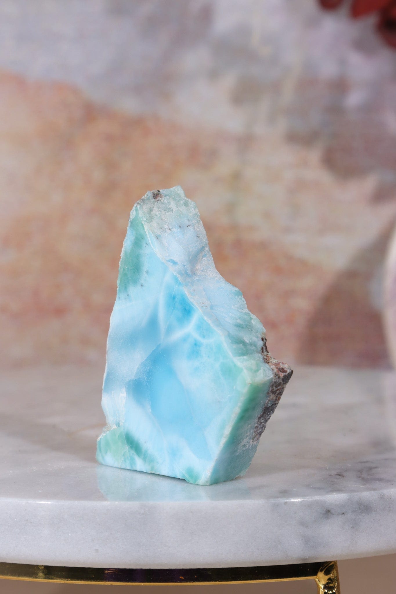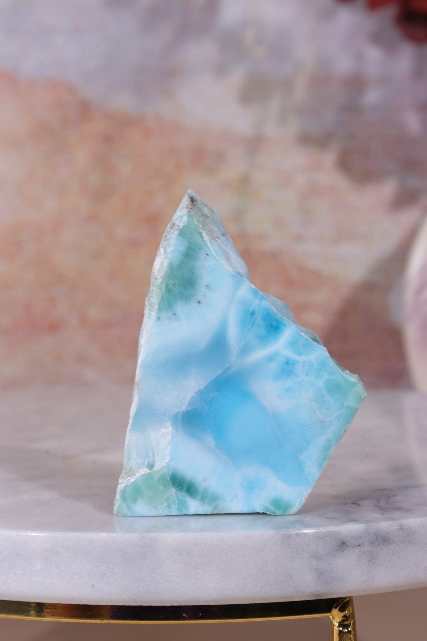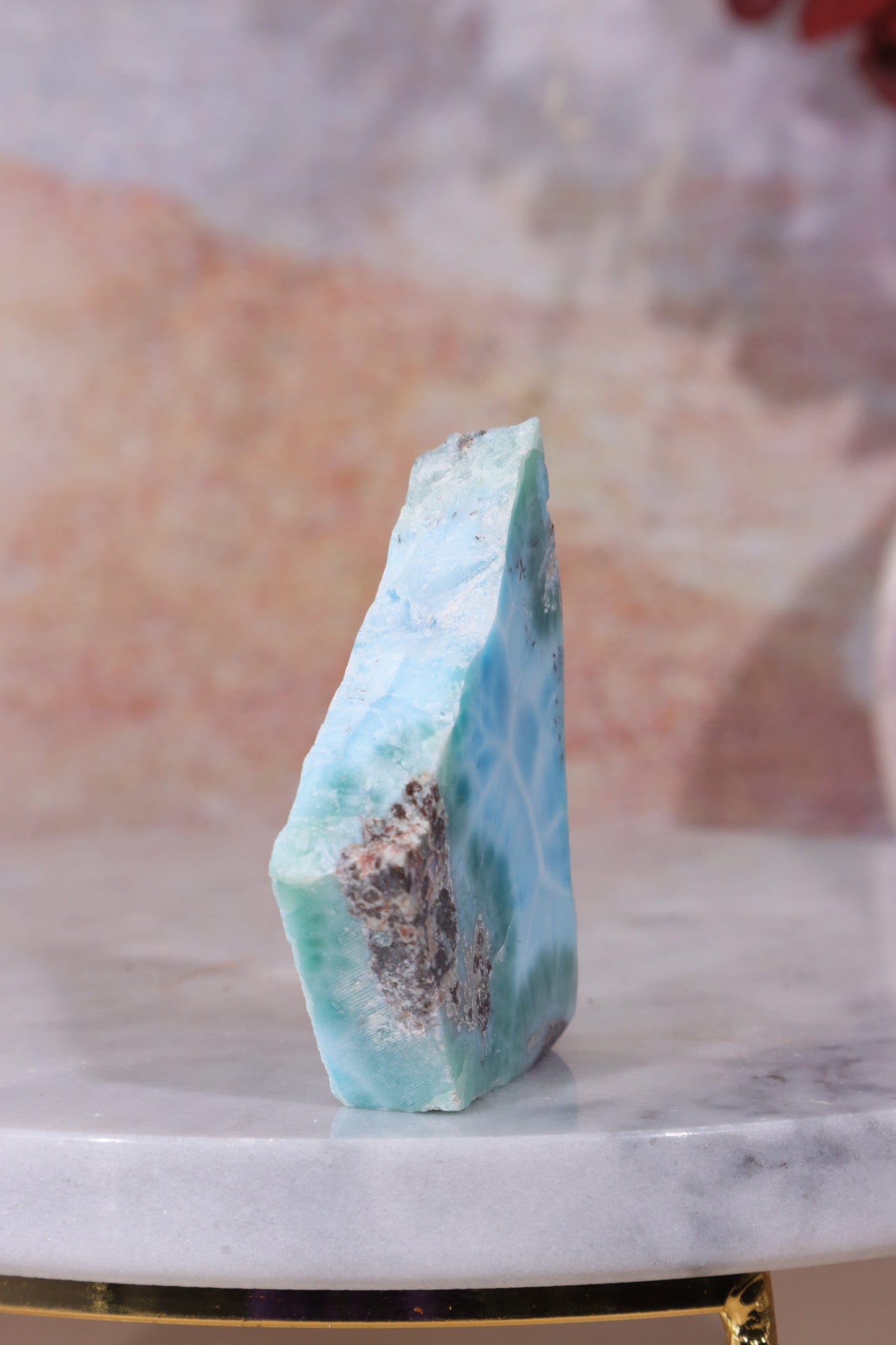 Larimar was first discovered in the early 20th century in the Dominican Republic by a local Dominican and a visiting Peace Corps volunteer. They named the stone Larimar after combining Larissa, the name of the local man's daughter, and mar, the Spanish word for sea, after the crystal’s resemblance to the waters of the Caribbean. Larimar is formed through a combination of volcanic activity and hydrothermal processes, and is primarily composed of pectolite, a sodium calcium silicate mineral. It owes its distinctive blue colour to the presence of copper impurities.