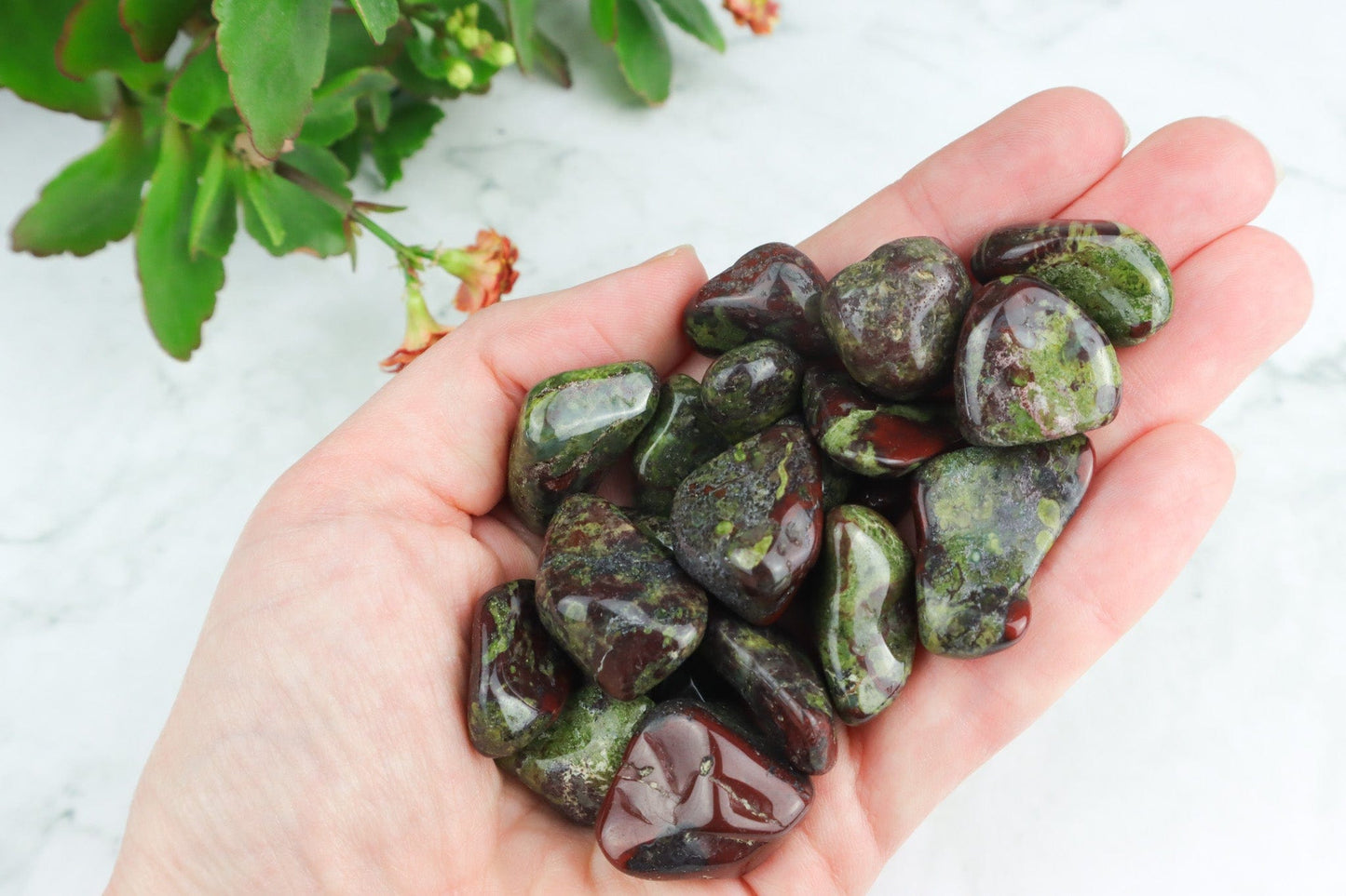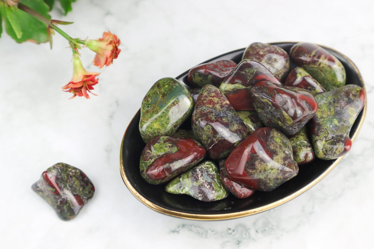 The green in the stone comes from Epidote, while the red is due to Piemontite, a manganese-rich mineral. This combination of colours and minerals is a rarity in the gem world, making Dragon Blood Jasper highly sought after for both its beauty and its metaphysical properties.