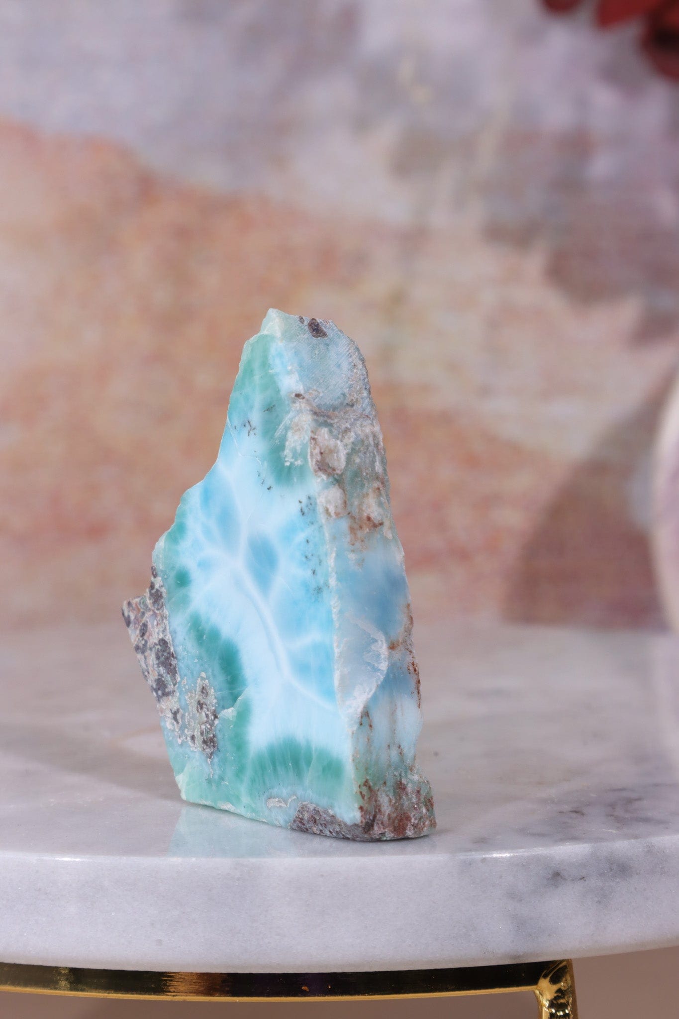 Larimar was first discovered in the early 20th century in the Dominican Republic by a local Dominican and a visiting Peace Corps volunteer. They named the stone Larimar after combining Larissa, the name of the local man's daughter, and mar, the Spanish word for sea, after the crystal’s resemblance to the waters of the Caribbean. Larimar is formed through a combination of volcanic activity and hydrothermal processes, and is primarily composed of pectolite, a sodium calcium silicate mineral. It owes its distinctive blue colour to the presence of copper impurities.