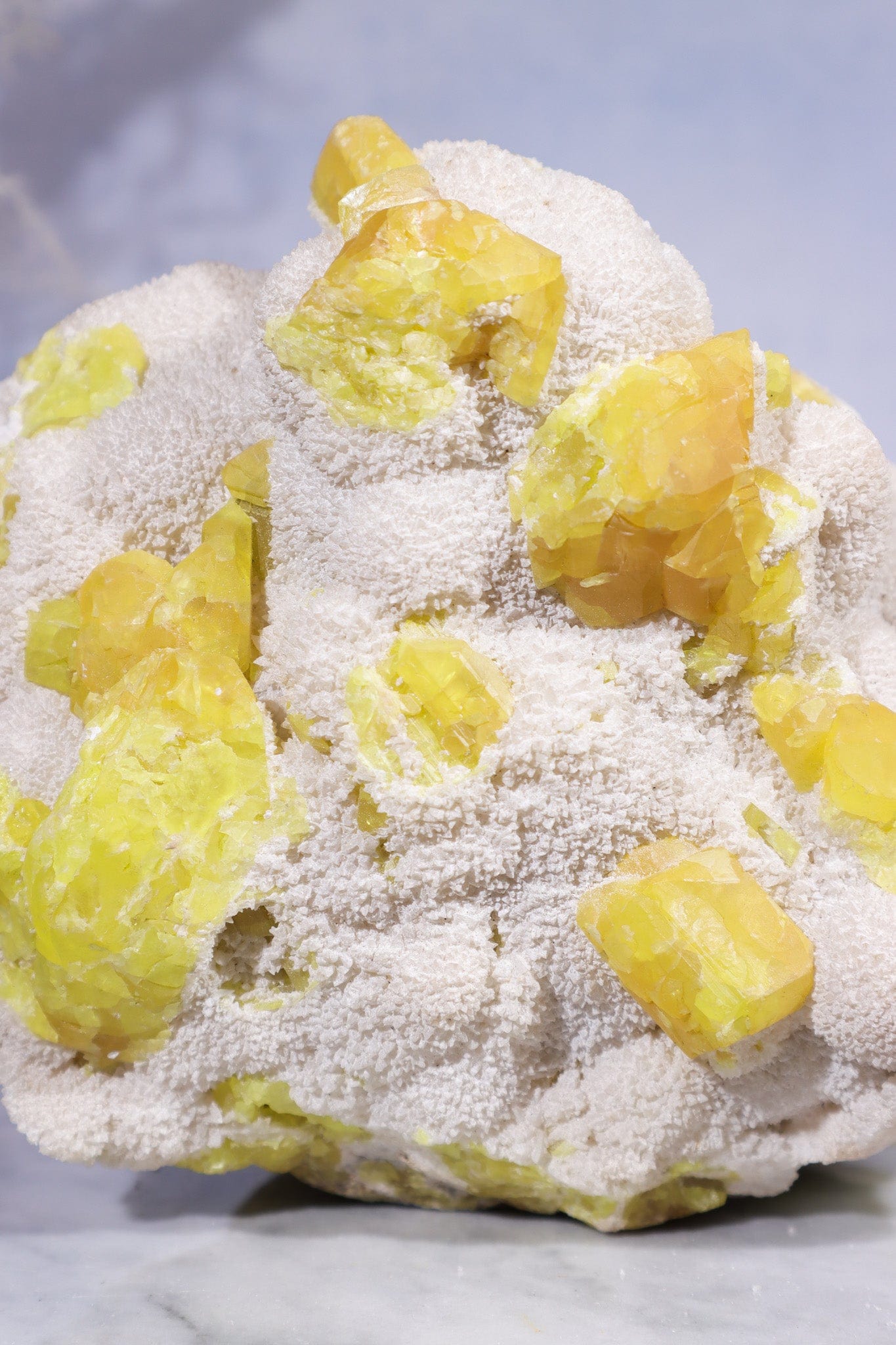 Sulphur, named after the Latin word "sulphurium," meaning "burning stone," is a vivid yellow mineral known for its association with fire and brimstone. It forms in volcanic areas and hot springs, arising from the Earth's depths through volcanic activity. The vibrant yellow colour of Sulphur is attributed to its inherent chemical composition. Sulphur has been utilised for various purposes, including as a traditional remedy in alchemy and as a key ingredient in the production of gunpowder and matches.
