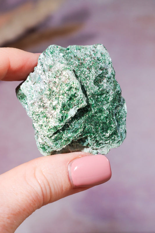 Green Fuchsite, derived from the German word "fuchs'' meaning "fox,'' was named for its discovery in Fuchstadt, Germany. This captivating crystal embodies the lush greenery of nature, owing its hue to the presence of chromium in its composition.