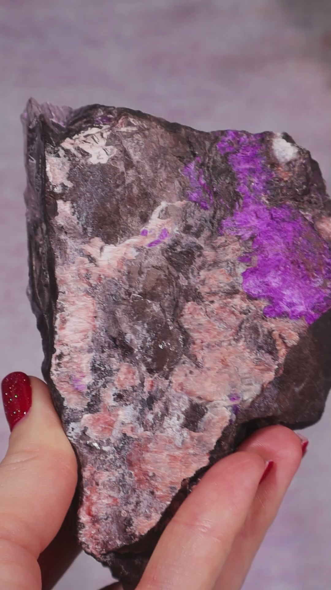 This unique 0.7kg Sugilite and Bustamite specimen from South Africa is a striking combination of two rare and powerful minerals. The vivid purples of Sugilite blend beautifully with the soft pink tones of Bustamite, creating a visually captivating and energetically balanced piece.