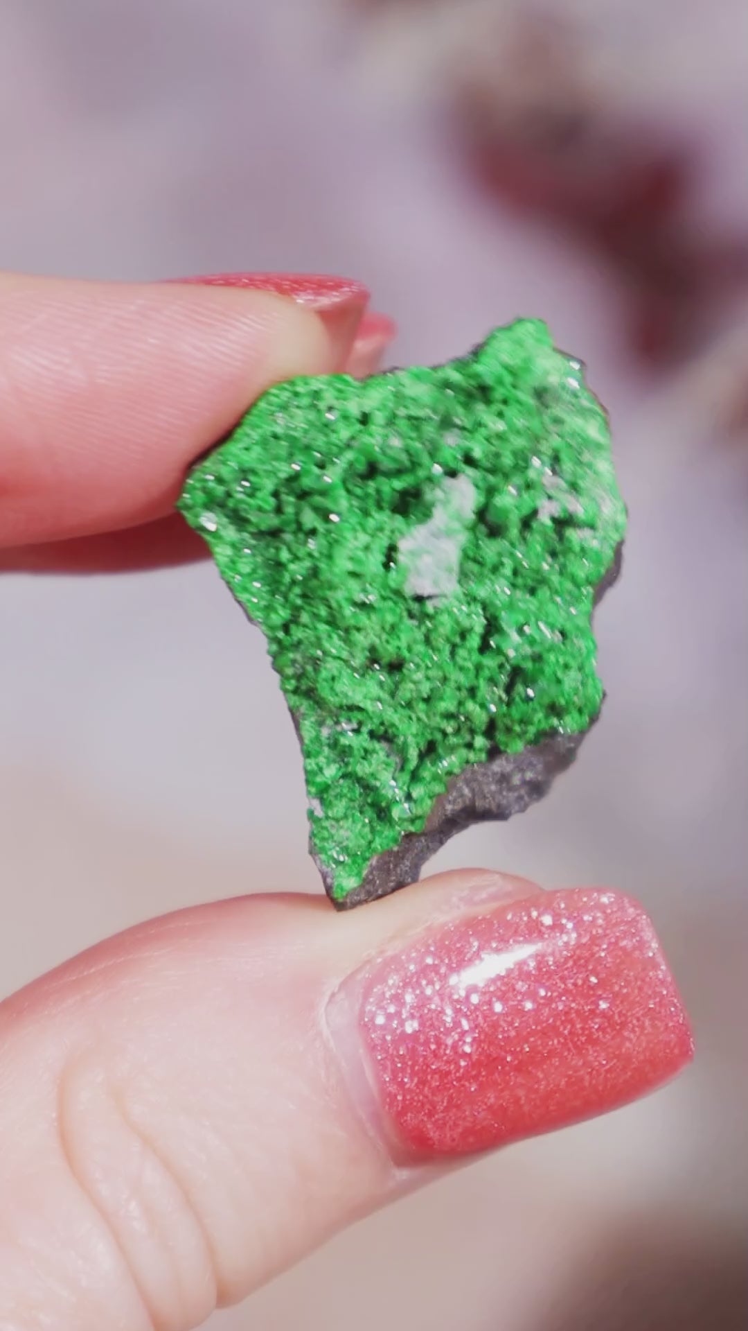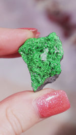 This beautiful sparkly Uvarovite specimen has a soft energy for inner harmony with calcite inclusion.