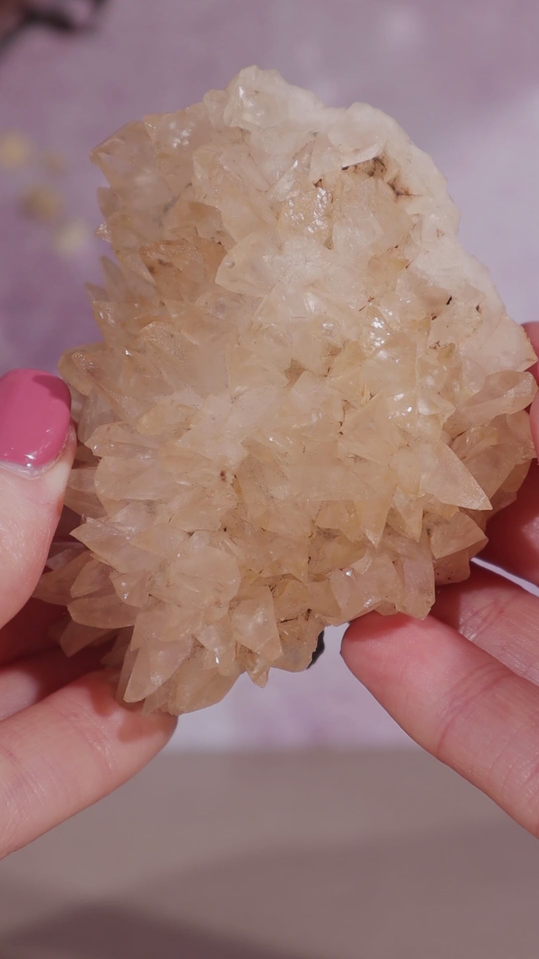 Dogtooth Calcite, is a variety of Calcite mineral that forms distinct rhombohedral or scalenohedral crystals (the form of the unequal triangles). Dogtooth Calcite has energising and balancing properties, and is also considered an ascension stone. Its connection with the Crown Chakra boosts one to higher spiritual realms and enhances spiritual growth. Dogtooth Calcite is thought to aid in meditation by facilitating a deeper connection with one's higher self and promoting spiritual insight and awareness.