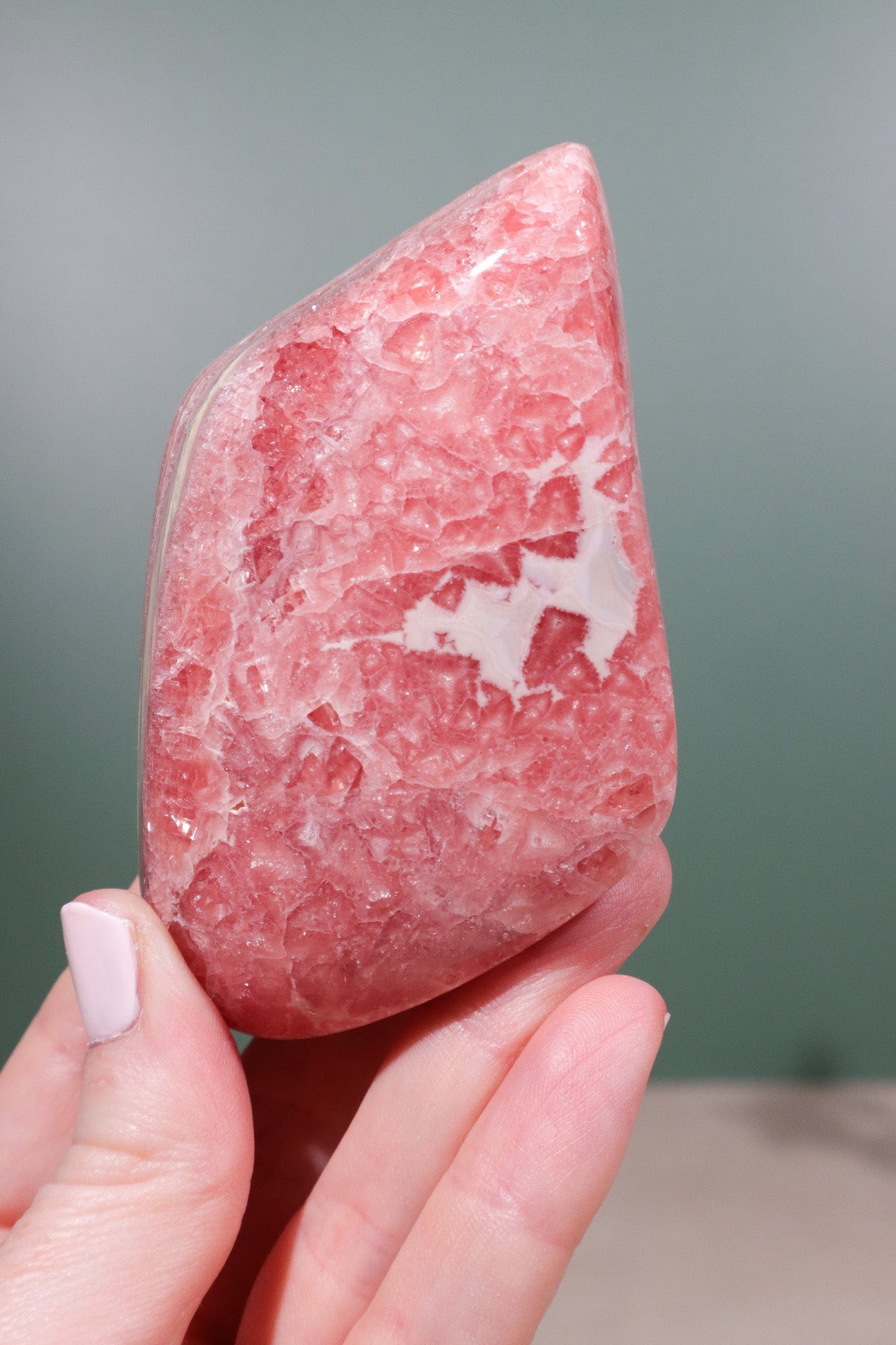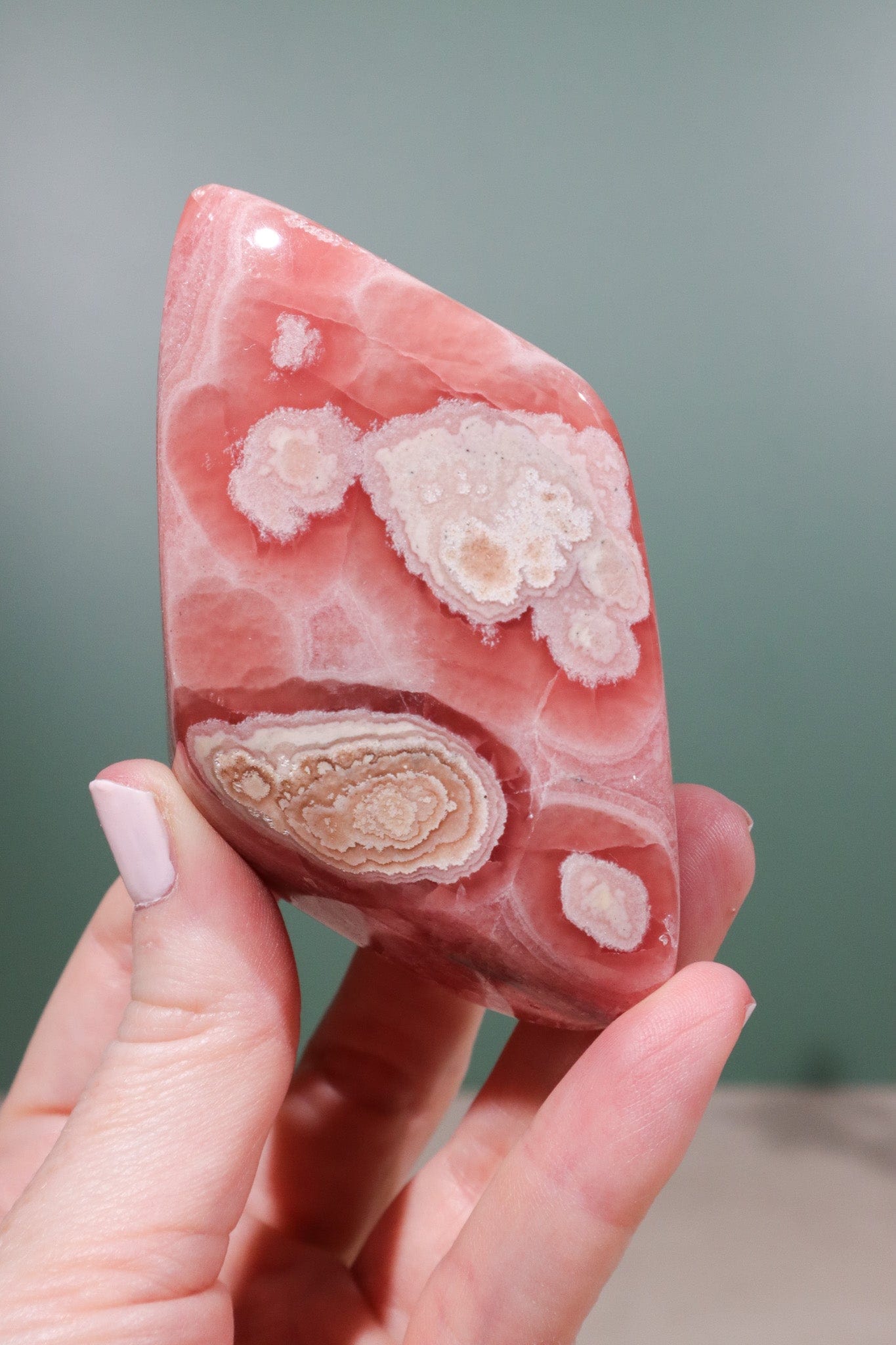 This gorgeous piece of Rhodochrosite is self standing